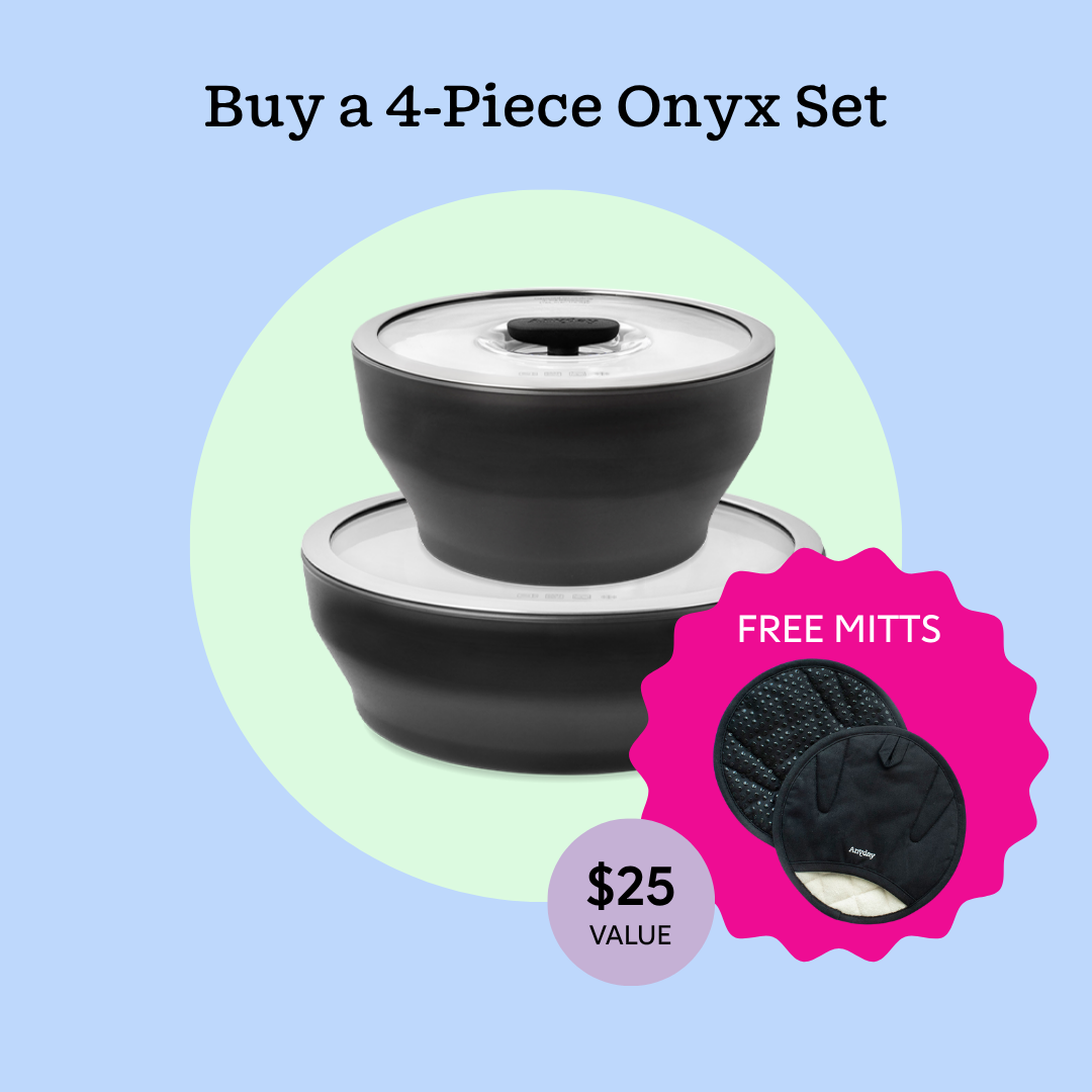 Our lids are made of glass with a vented knob that helps trap steam for faster, even cooking while also allowing excess steam to escape. This serves a dual purpose of keeping your food moist and preventing spills and messes. When not using for cooking and reheating, simply press the vented knob down for airtight food storage.