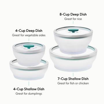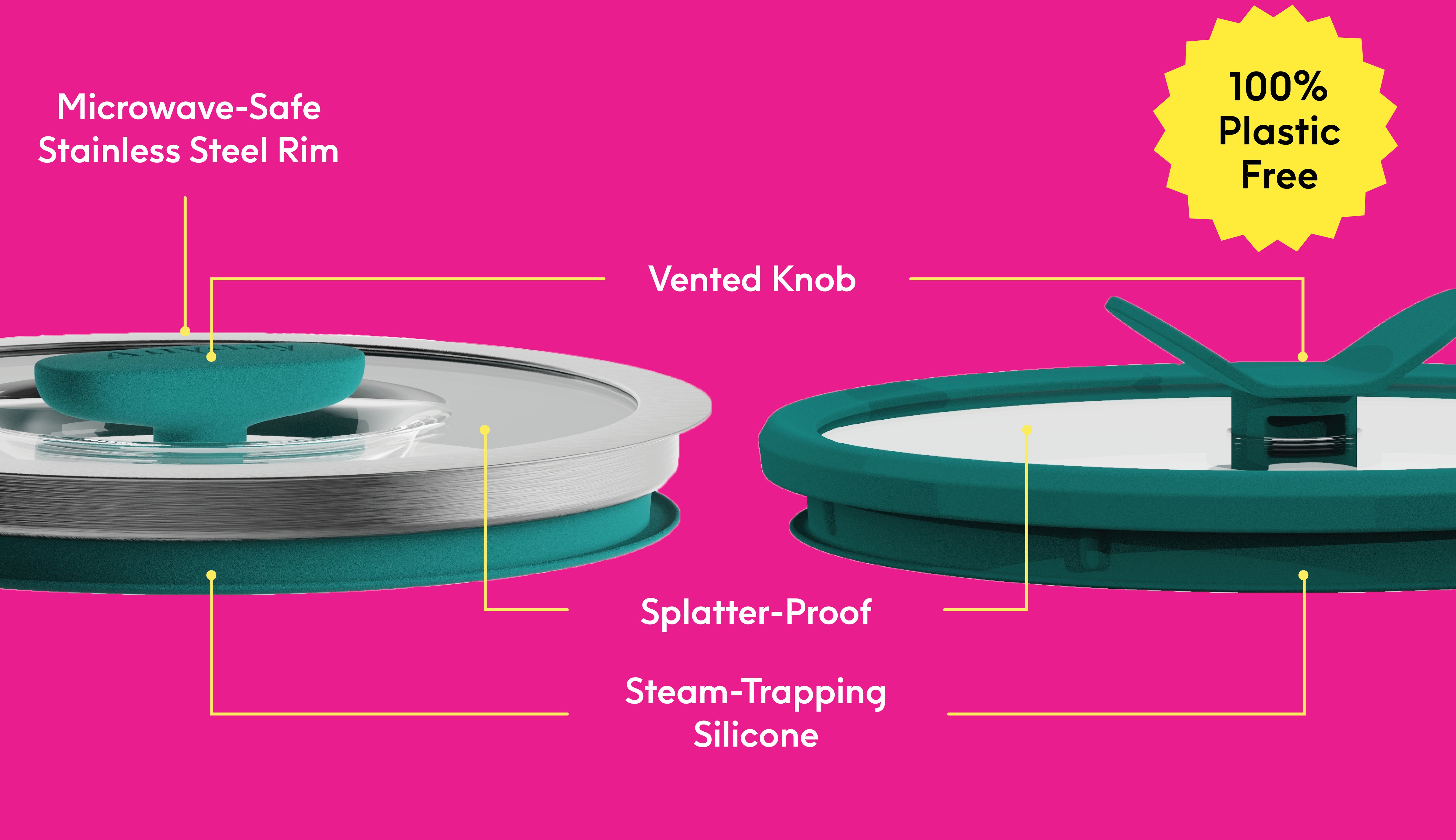 Our lids are made of glass with a vented knob that helps trap steam for faster, even cooking while also allowing excess steam to escape. This serves a dual purpose of keeping your food moist and preventing spills and messes. When not using for cooking and reheating, simply press the vented knob down for airtight food storage.