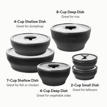 Our dishes come in a variety of shapes and sizes to meet all your storage needs. Our classic round dishes come in two versatile shapes—shallow and deep—in Small, Medium, Large, Extra Large. Square, our newest shape, comes in Small, Medium, and Large sizes. To learn more about our dishes, including volumes and dimensions, please visit our FAQ’s.
