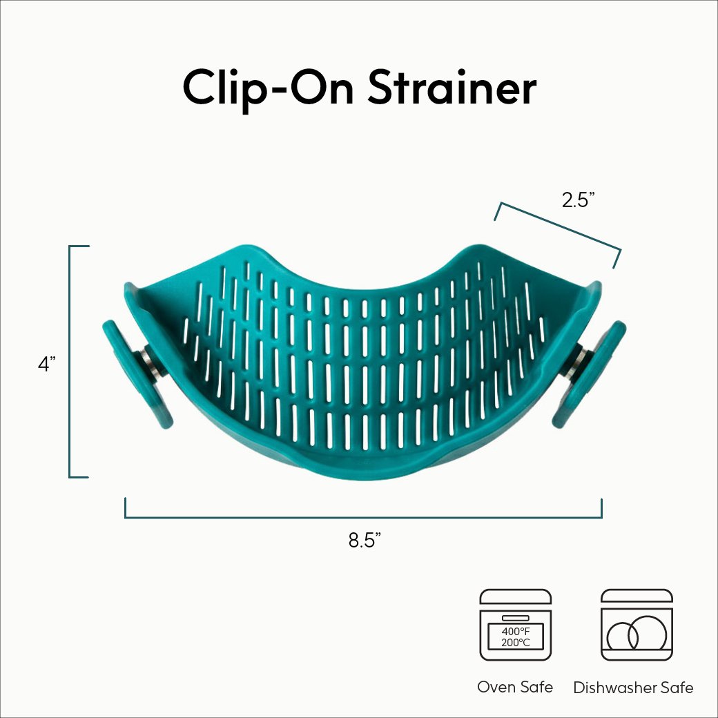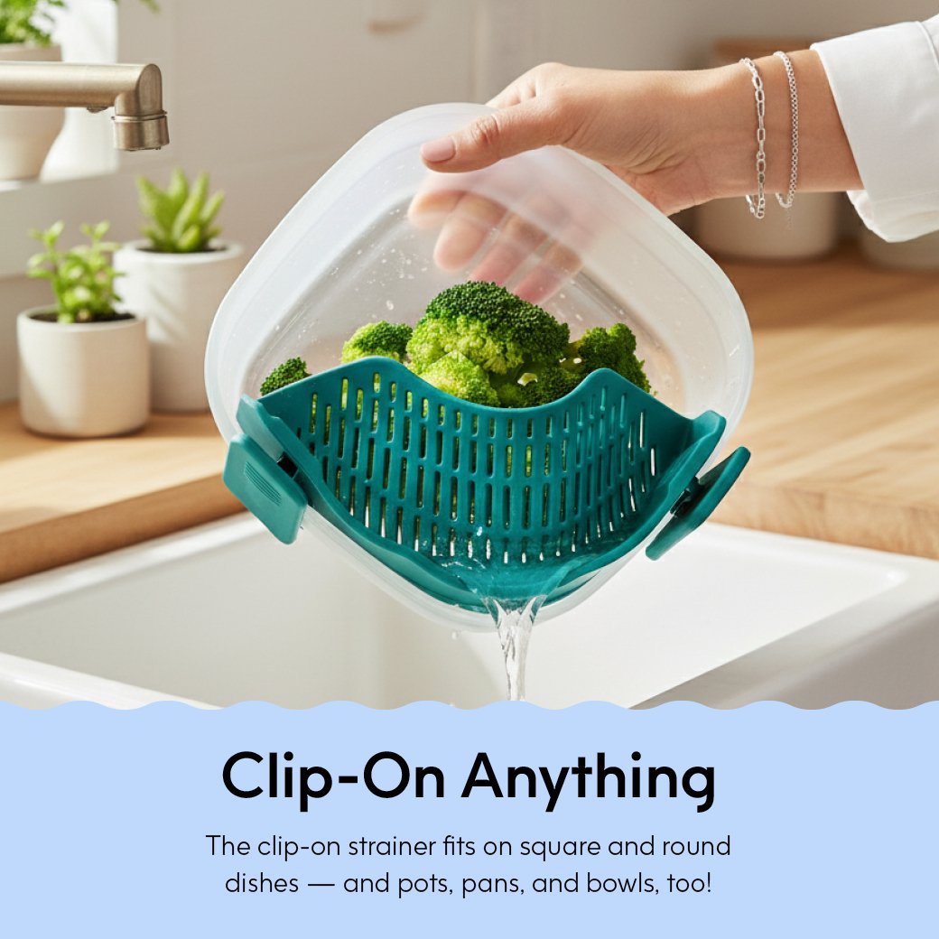Introducing: The Strainer! Flexible-yet-sturdy clips attach this clever ‘colander’ onto your Anyday dish, making it a master multitasker. Use this strainer on any size or shape Anyday dish.