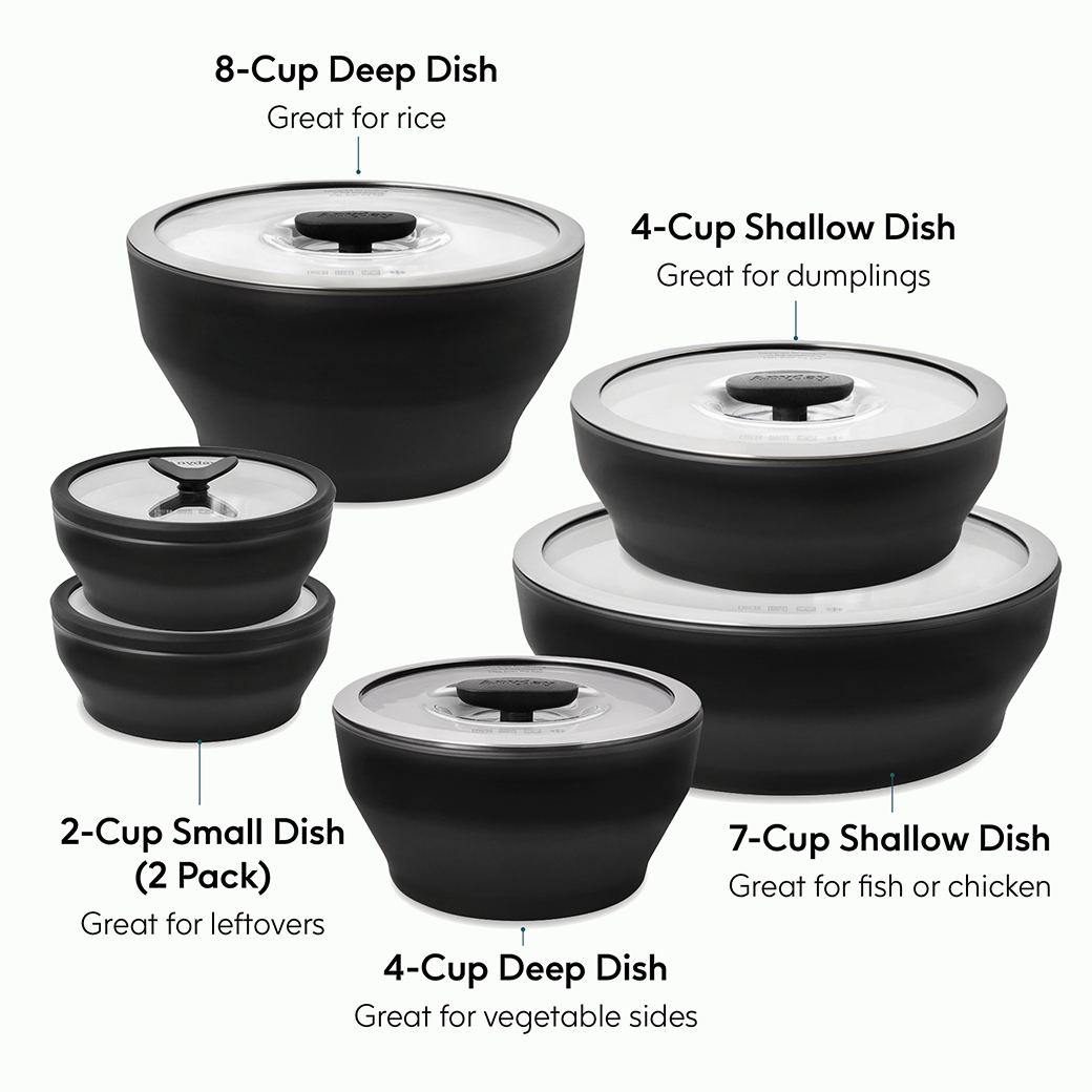 Our lids are made of glass with a vented knob that helps trap steam for faster, even cooking while also allowing excess steam to escape. This serves a dual purpose of keeping your food moistandpreventing spills and messes. When not using for cooking and reheating, simply press the vented knob down for airtight food storage.
