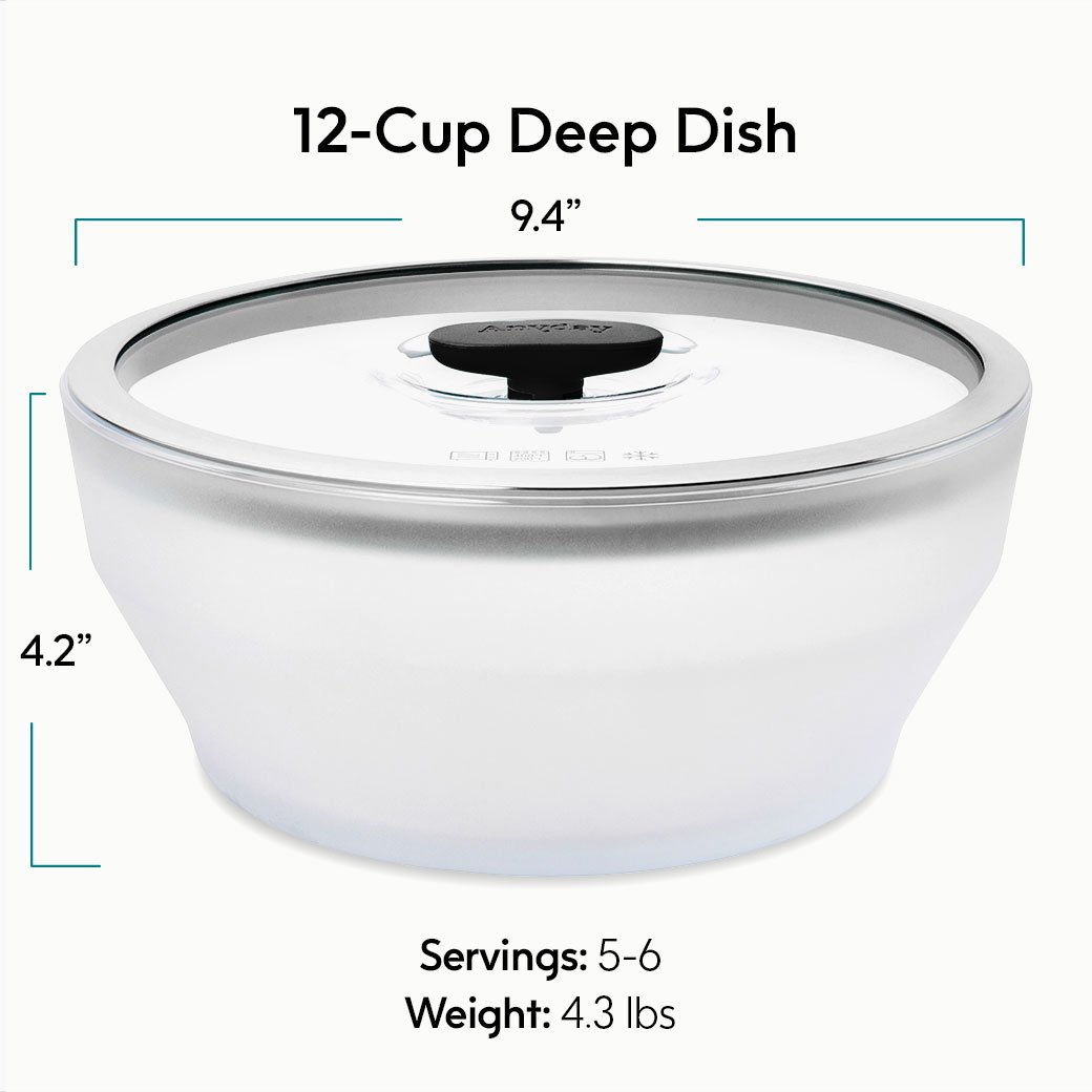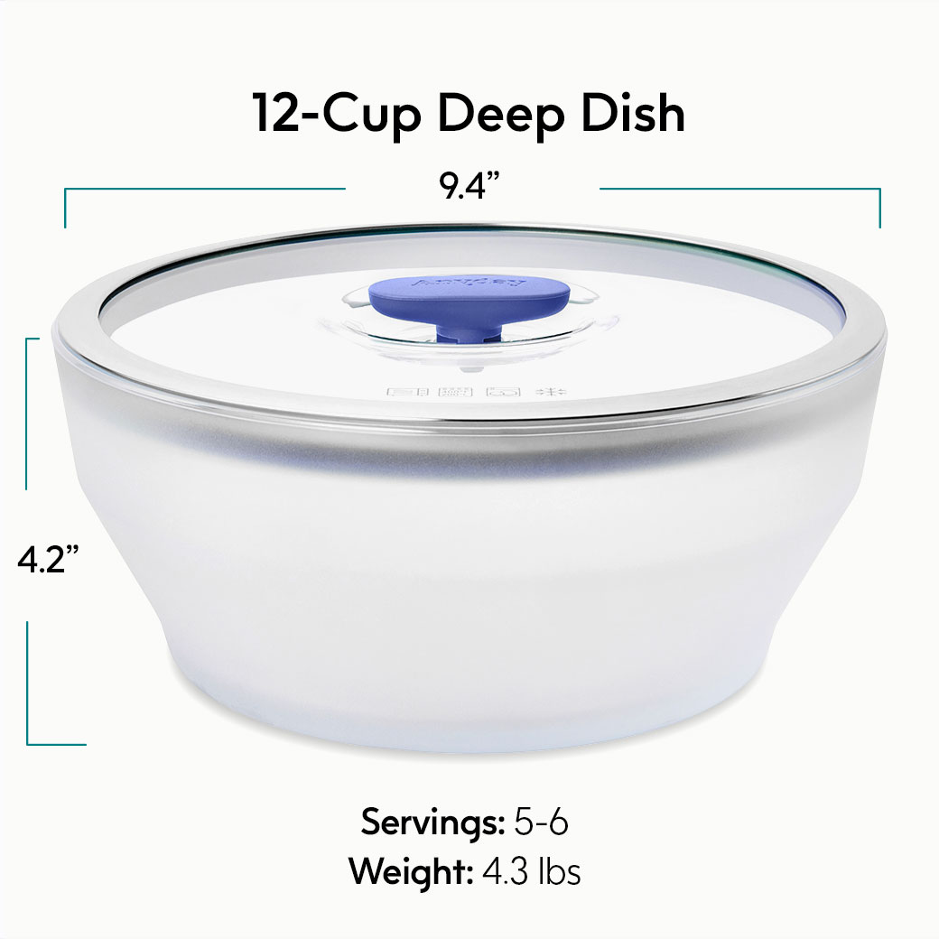 This durable frosted glass food storage container with a vented glass lid also doubles as versatile microwave cookware. Ideal for meal-prepping large portions of food, storing big batch soups, and feeding a crowd, this container transfers seamlessly from the microwave, to the fridge, to the freezer, to the oven, to the table, and even the dishwasher. The lid is reinforced with a microwave-safe stainless steel rim that will stand the test of time.