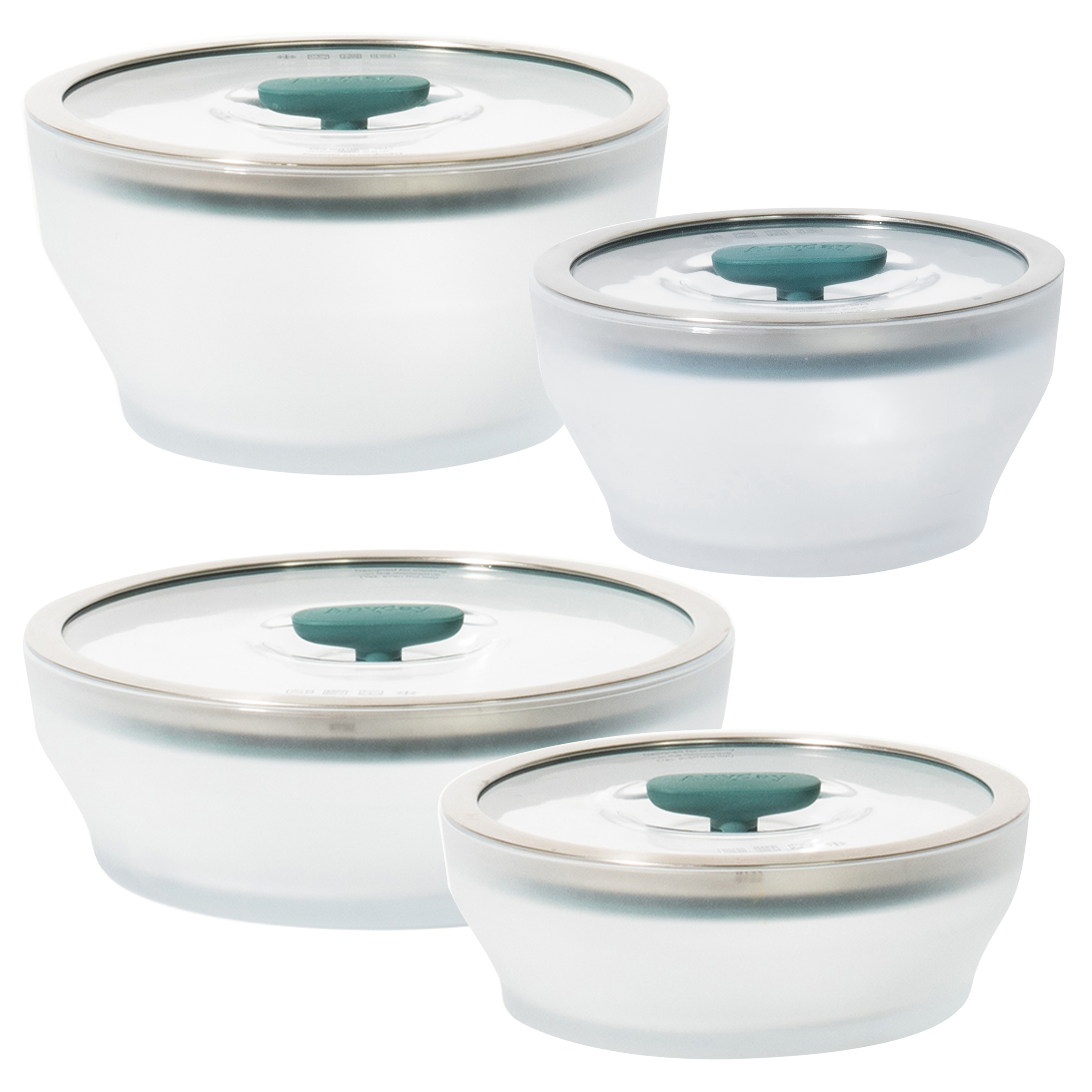 Our lids are made of glass with a vented knob that helps trap steam for faster, even cooking while also allowing excess steam to escape. This serves a dual purpose of keeping your food moist and preventing spills and messes. When not using for cooking and reheating, simply press the vented knob down for airtight food storage.