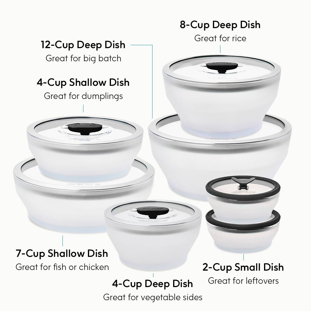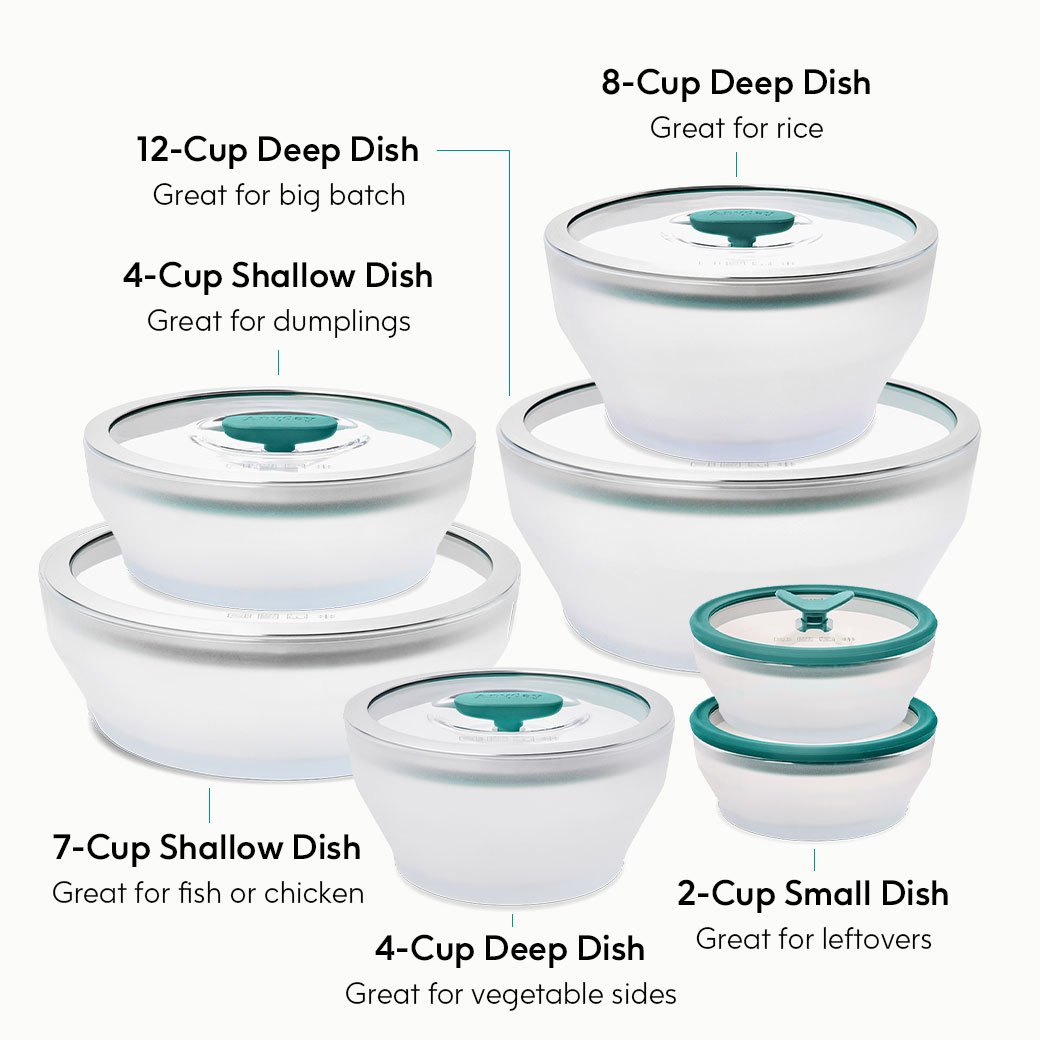 Build your plastic-free kitchen with every round dish size we offer in our premium frosted glass collection. Designed as versatile microwave cookware, these durable frosted glass dishes also double as food storage containers with vented glass lids. Ideal for reheating leftovers, cooking from frozen, or steaming meals from scratch, these dishes will be the most-used tools in your kitchen.