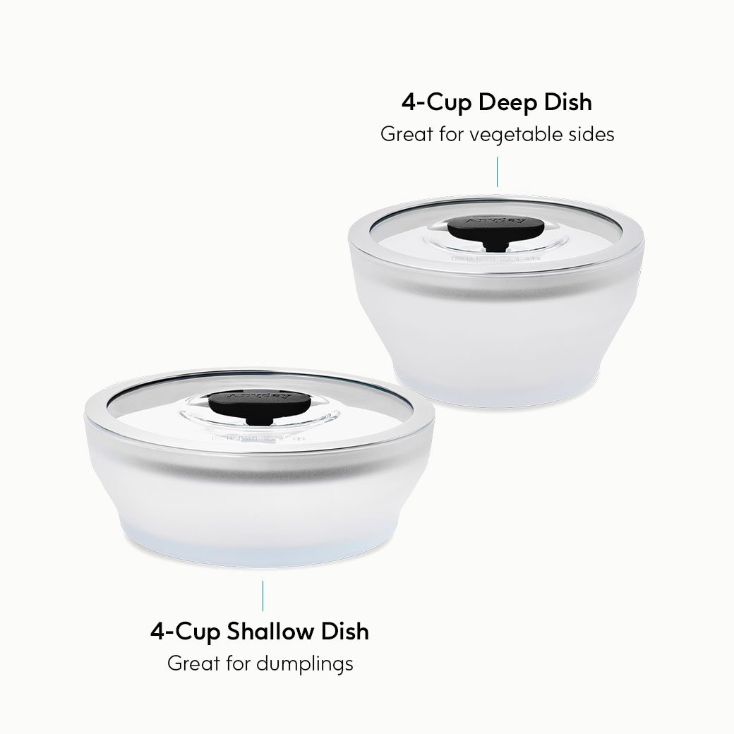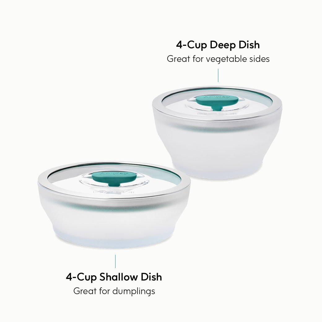 Build your plastic-free kitchen with our premium frosted glass collection. Designed as versatile microwave cookware, these durable frosted glass dishes also double as food storage containers with vented glass lids. Ideal for reheating leftovers, cooking from frozen, or steaming meals from scratch, these dishes will be the most-used tools in your kitchen. Each lid in this set is reinforced with a microwave-safe stainless steel rim that will stand the test of time.