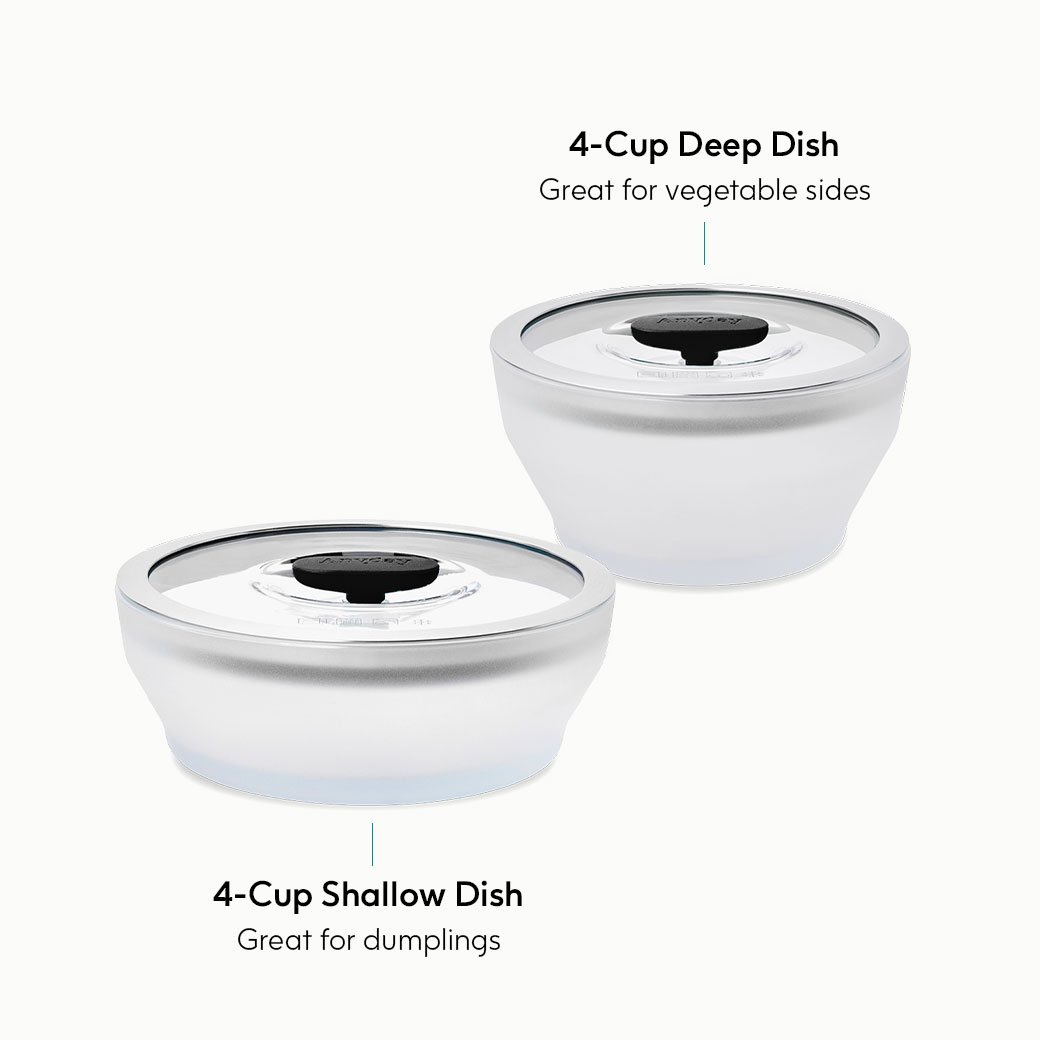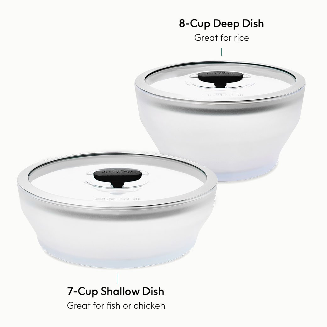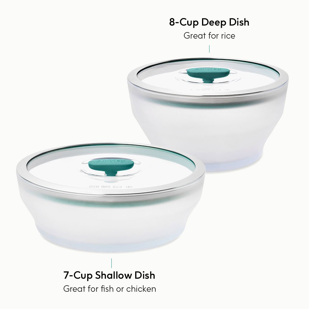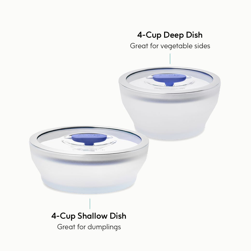 Build your plastic-free kitchen with our premium frosted glass collection. Designed as versatile microwave cookware, these durable frosted glass dishes also double as food storage containers with vented glass lids. Ideal for reheating leftovers, cooking from frozen, or steaming meals from scratch, these dishes will be the most-used tools in your kitchen. Each lid in this set is reinforced with a microwave-safe stainless steel rim that will stand the test of time.