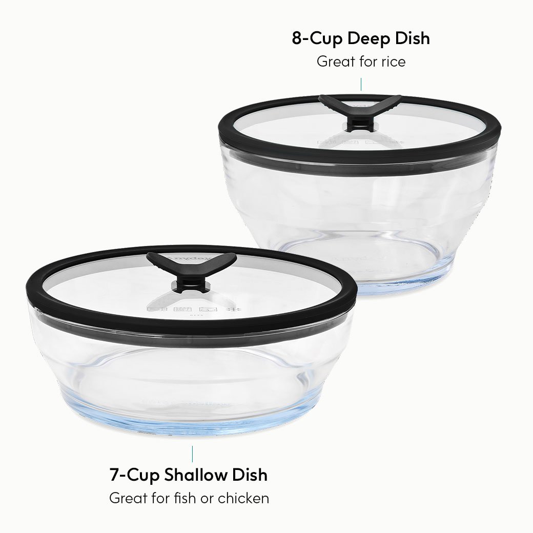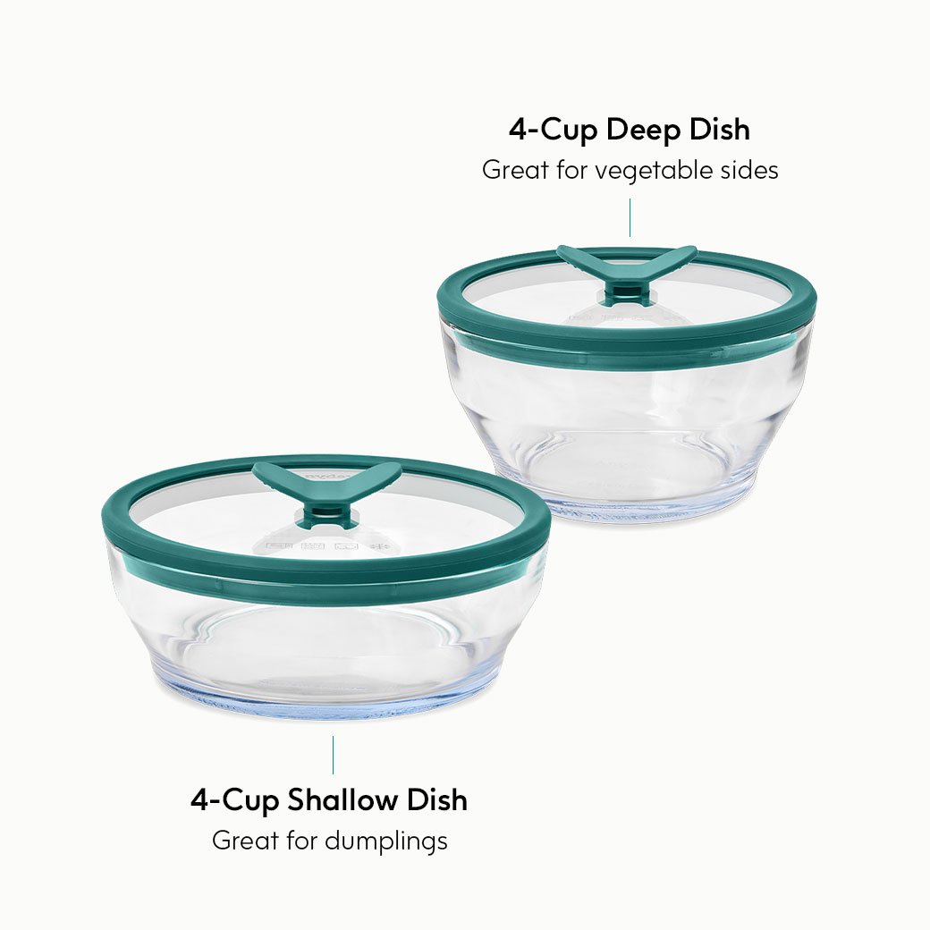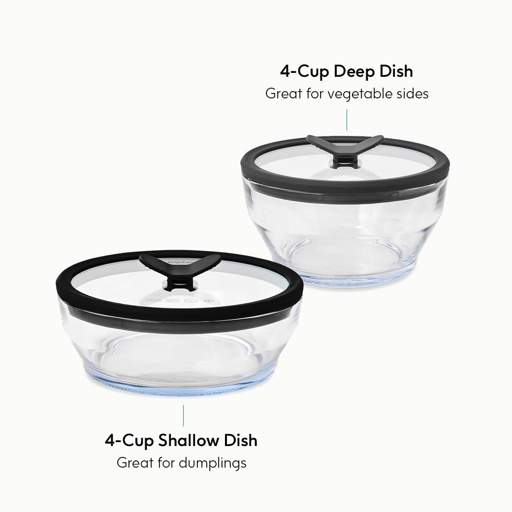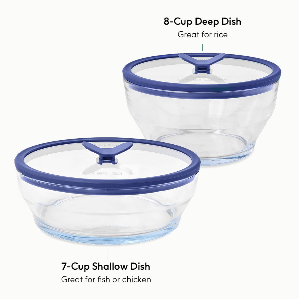 - 4-Cup Glass Round Deep Dish + Lid (6.3” D x 3.4” H, 2 lbs)
