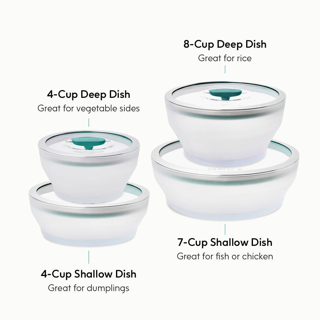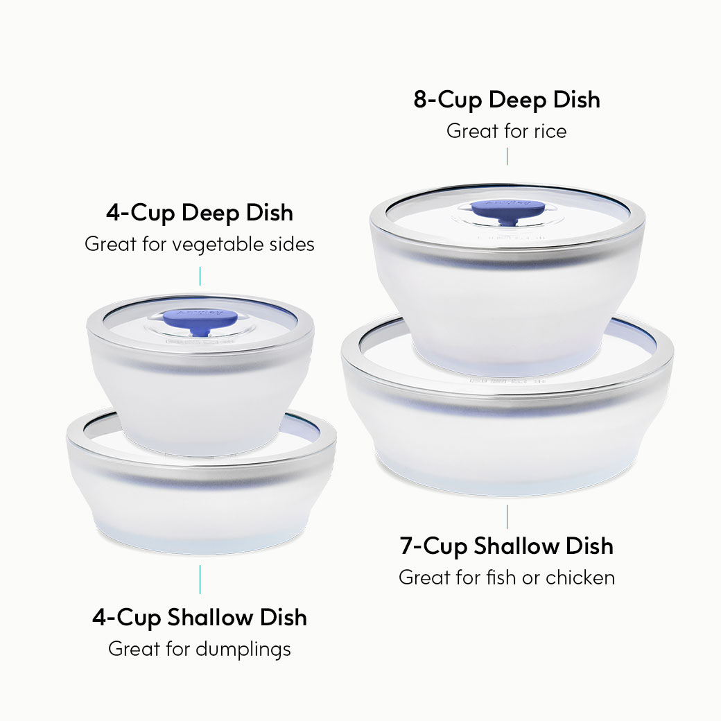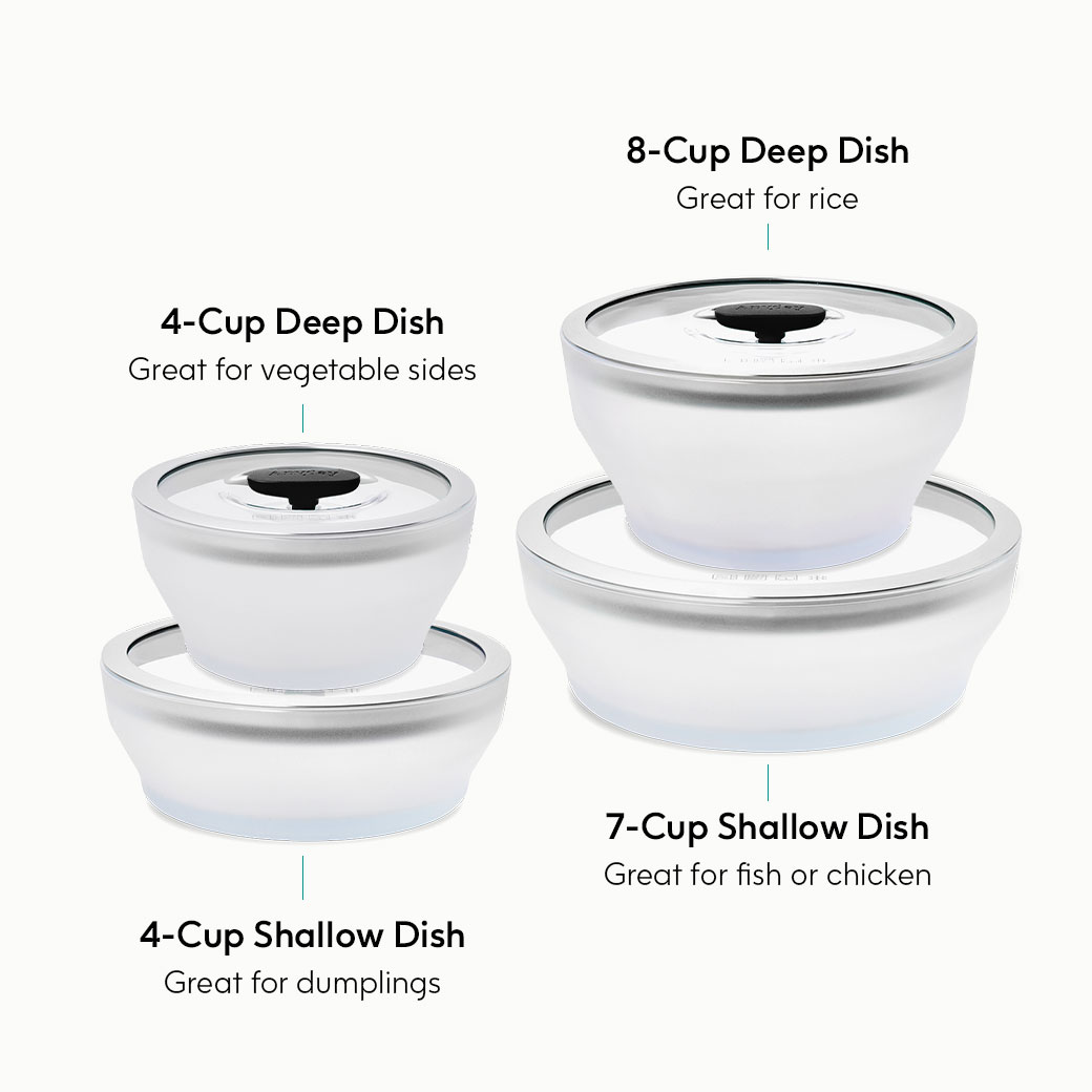 Build your plastic-free kitchen with our premium frosted glass collection. Designed as versatile microwave cookware, these durable frosted glass dishes also double as food storage containers with vented glass lids. Ideal for reheating leftovers, cooking from frozen, or steaming meals from scratch, these dishes will be the most-used tools in your kitchen. Each lid in this set is reinforced with a microwave-safe stainless steel rim that will stand the test of time.