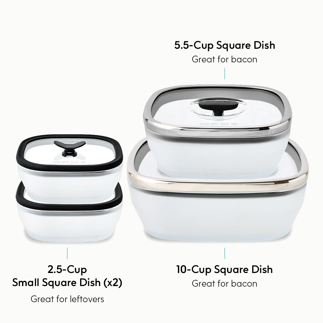 Build your plastic-free kitchen with our premium frosted glass collection in a space-saving square shape. Designed as versatile microwave cookware, these durable frosted glass dishes also double as food storage containers with vented glass lids. Ideal for cooking bacon, baking casseroles, and heating up frozen food, these dishes will be the most-used tools in your kitchen.