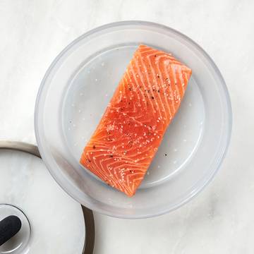 Place the fresh salmon in a plastic bag or airtight container, removing as much air as possible. Then freeze at 0° F or lower (ideally). Label the salmon with the date it was frozen and use it within 3-6 months. When you're ready to defrost the salmon, refrigerate it to thaw safely. You can also cook salmon directly from frozen, placing it in an Anyday Shallow dish and adding 1-minute intervals to the suggested cook time until the fish is cooked through.