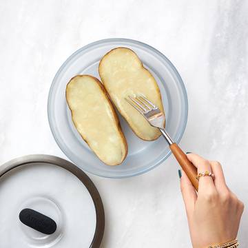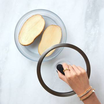 2. Place the cleaned potato, still wet, in the Anyday dish and cover with the lid (knob lifted).