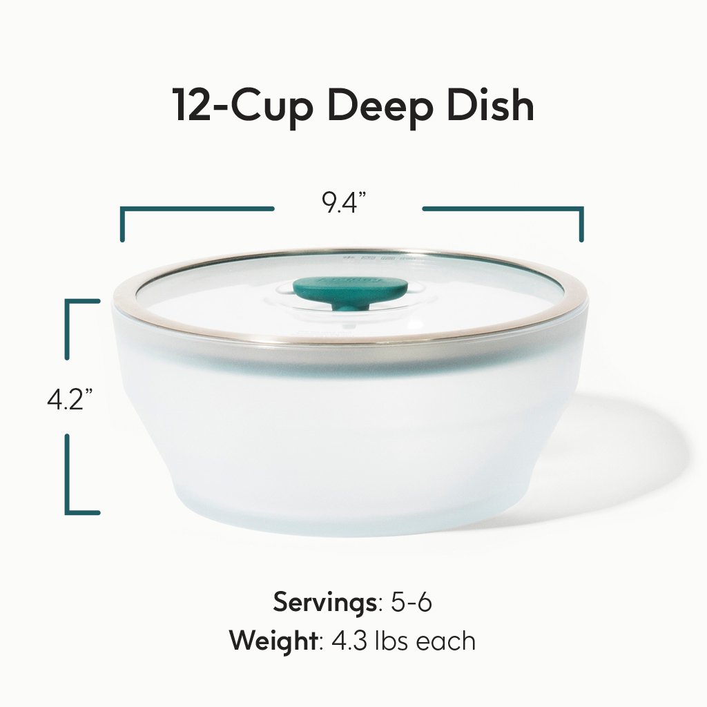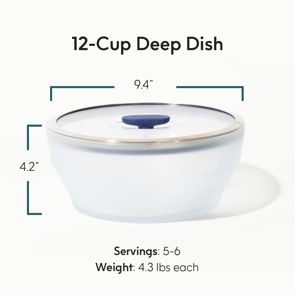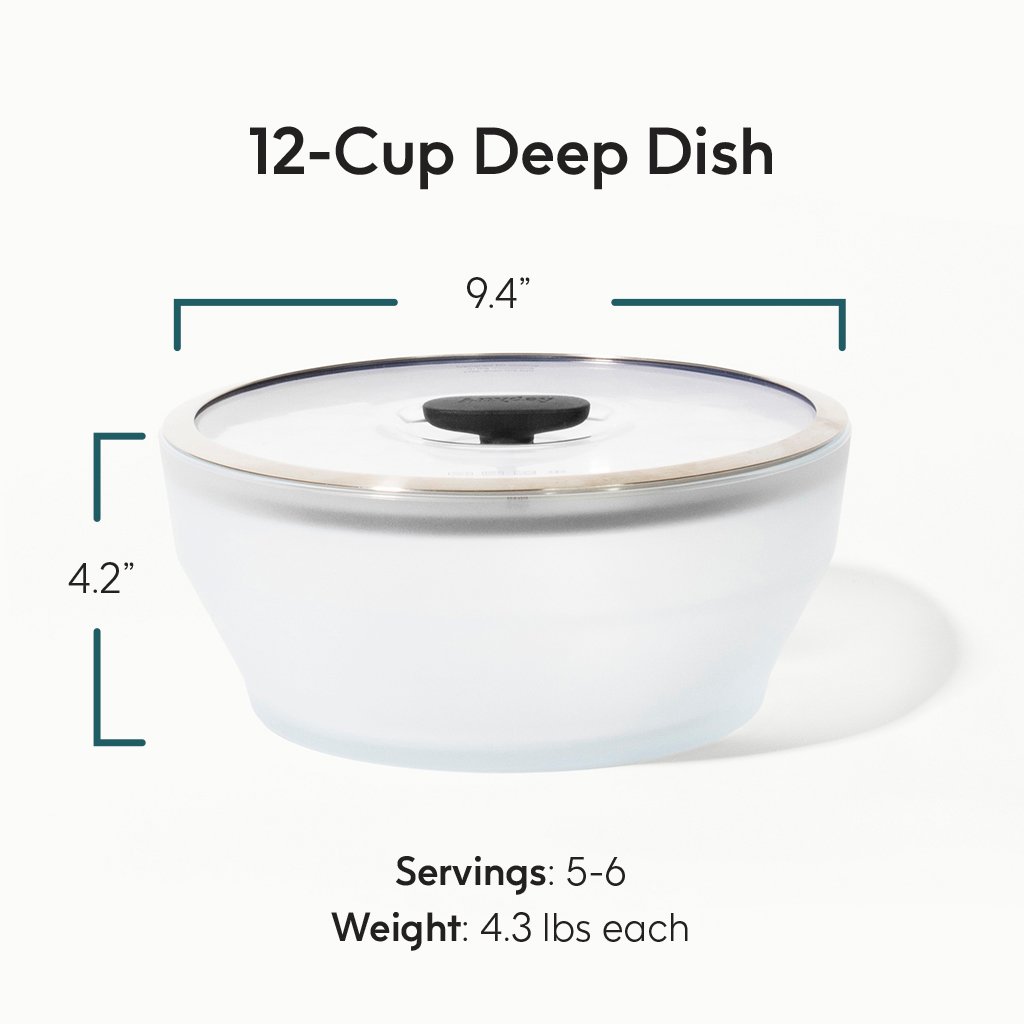 This durable frosted glass food storage container with a vented glass lid also doubles as versatile microwave cookware. Ideal for meal-prepping large portions of food, storing big batch soups, and feeding a crowd, this container transfers seamlessly from the microwave, to the fridge, to the freezer, to the oven, to the table, and even the dishwasher. The lid is reinforced with a microwave-safe stainless steel rim that will stand the test of time.